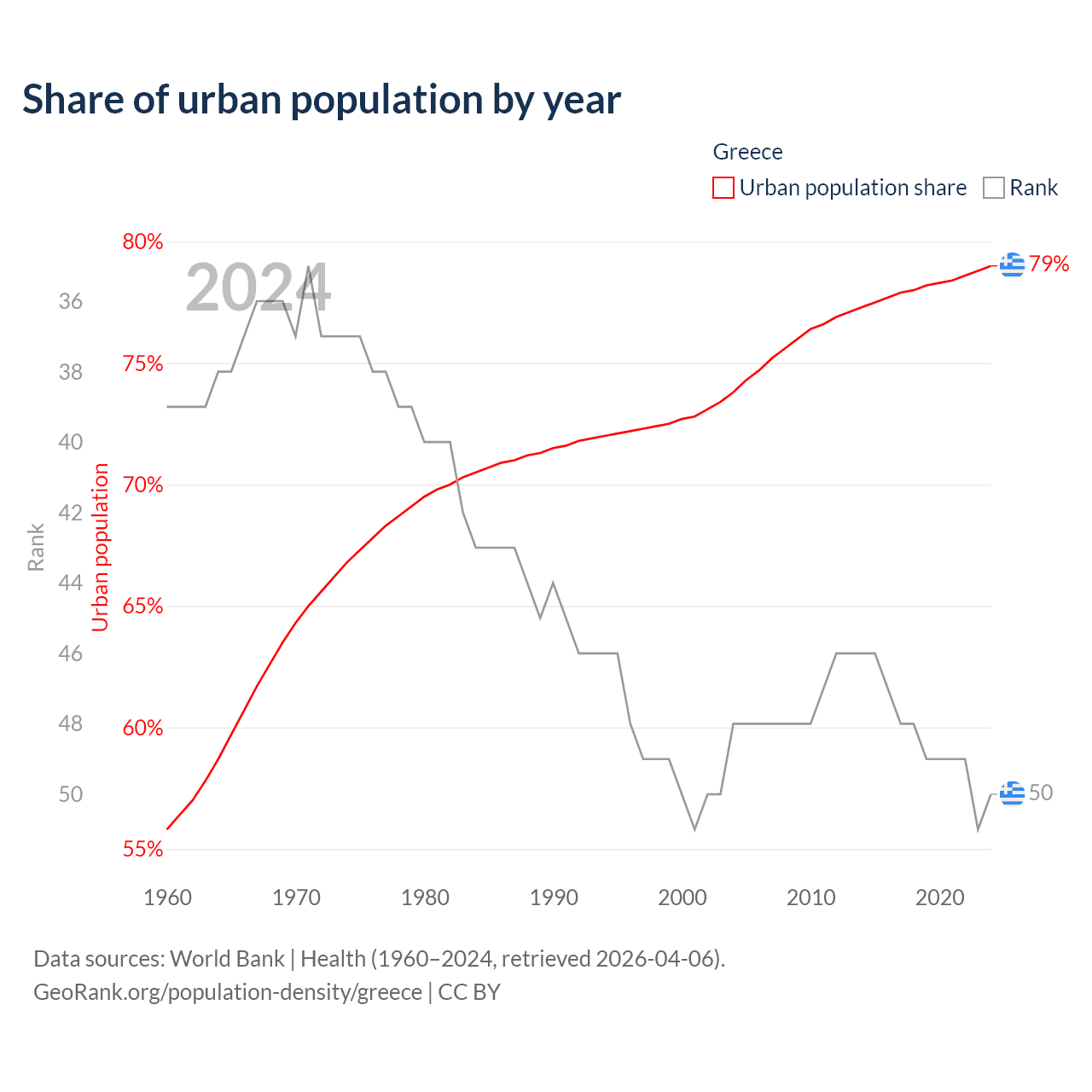 This chart shows the share of urban population in Greece from 1960 to 2024: 55.8% lived in urban areas in 1960, 72.7% in 2000, and 79% in 2024.