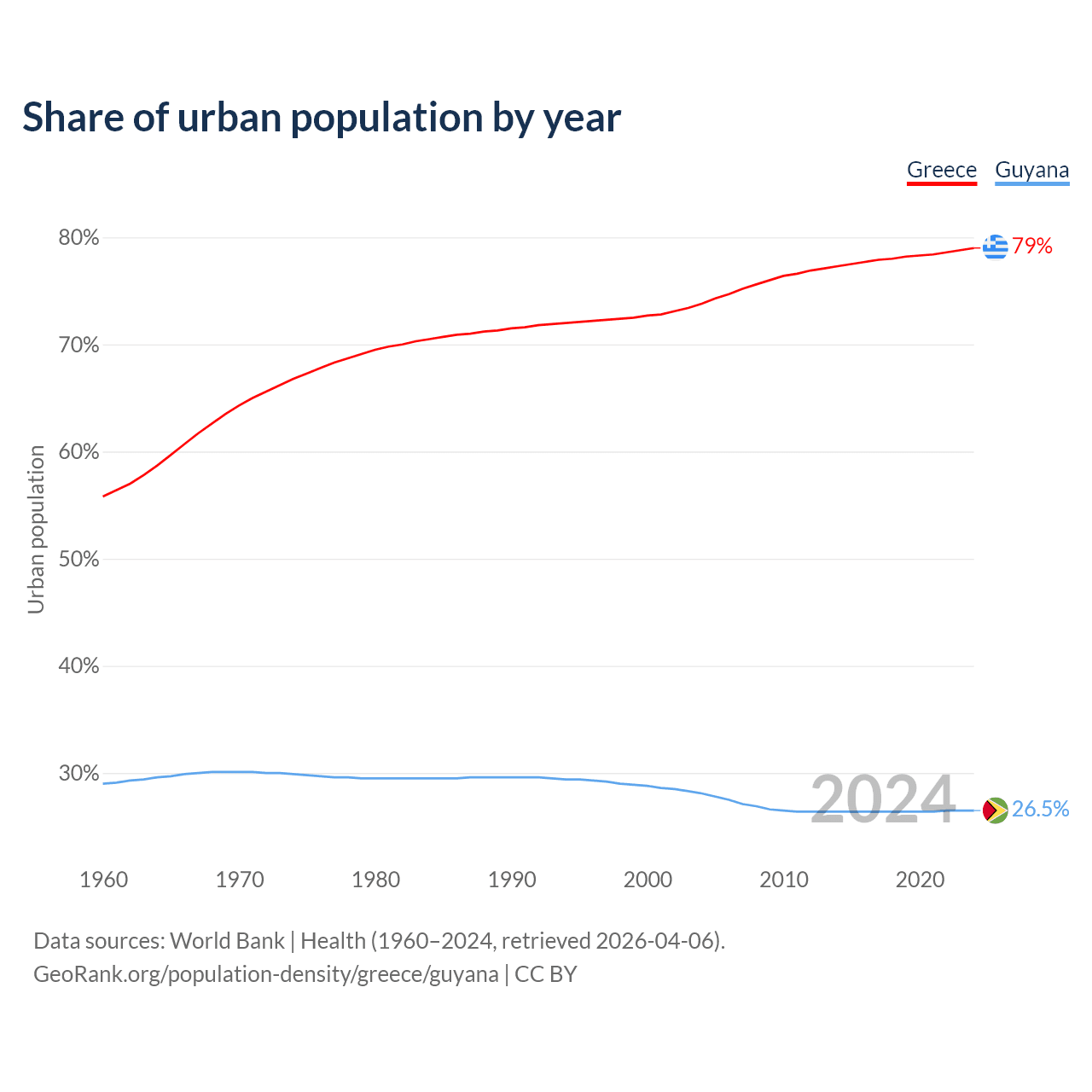 From 2004 to 2024, the share of urban population changed from 73.8% to 79% in Greece and from 28.1% to 26.5% in Guyana.