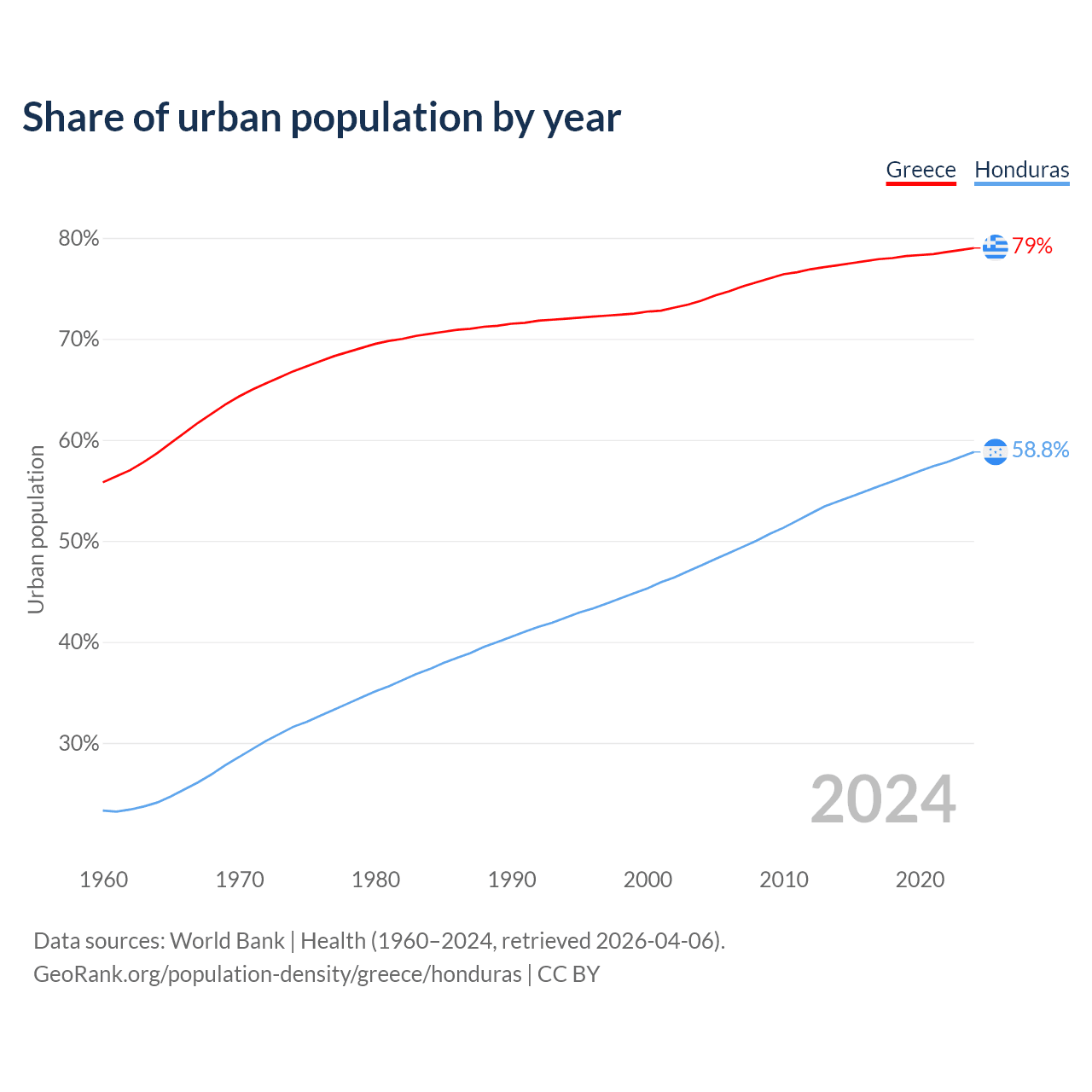 From 2004 to 2024, the share of urban population changed from 73.8% to 79% in Greece and from 47.6% to 58.8% in Honduras.