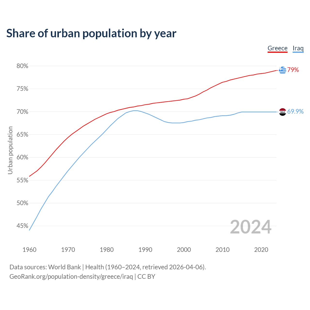 From 2004 to 2024, the share of urban population changed from 73.8% to 79% in Greece and from 68.2% to 69.9% in Iraq.