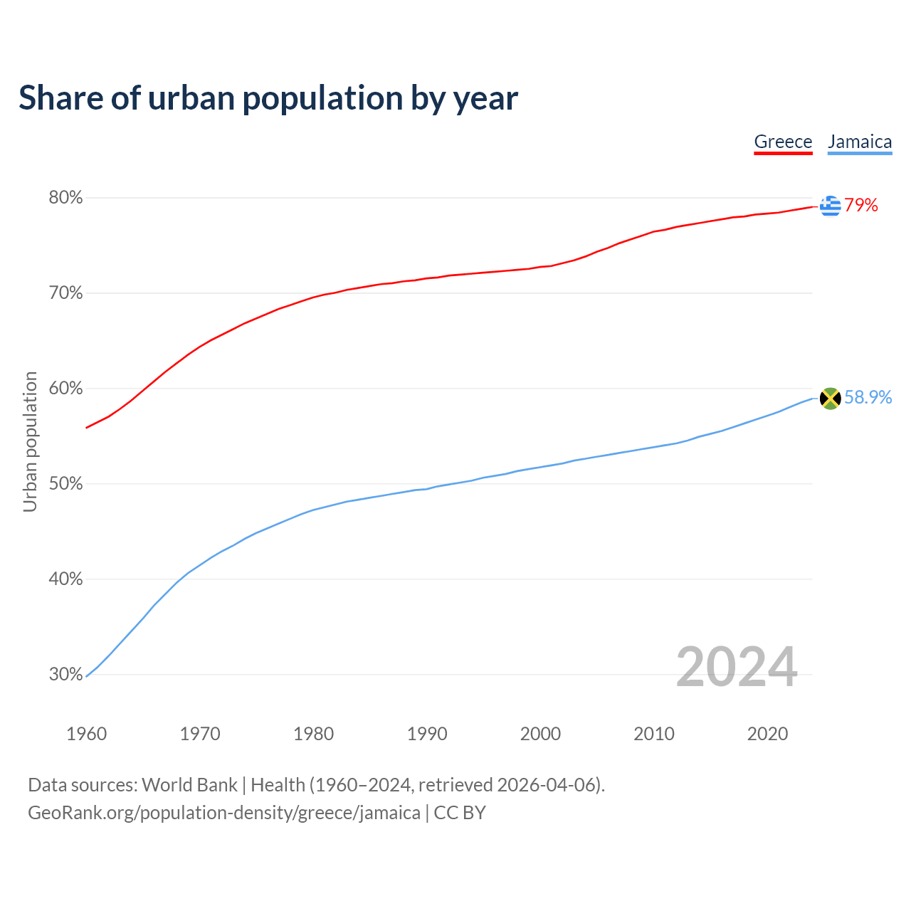From 2004 to 2024, the share of urban population changed from 73.8% to 79% in Greece and from 52.6% to 58.9% in Jamaica.