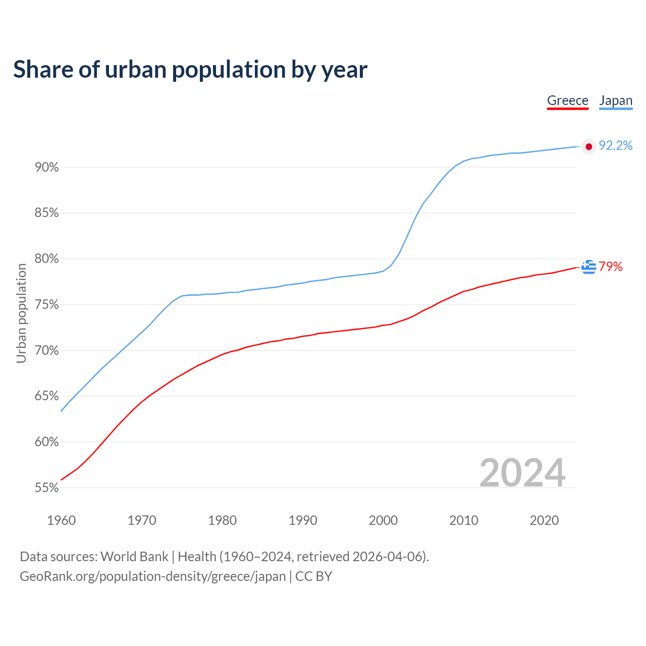 From 2004 to 2024, the share of urban population changed from 73.8% to 79% in Greece and from 84.4% to 92.2% in Japan.