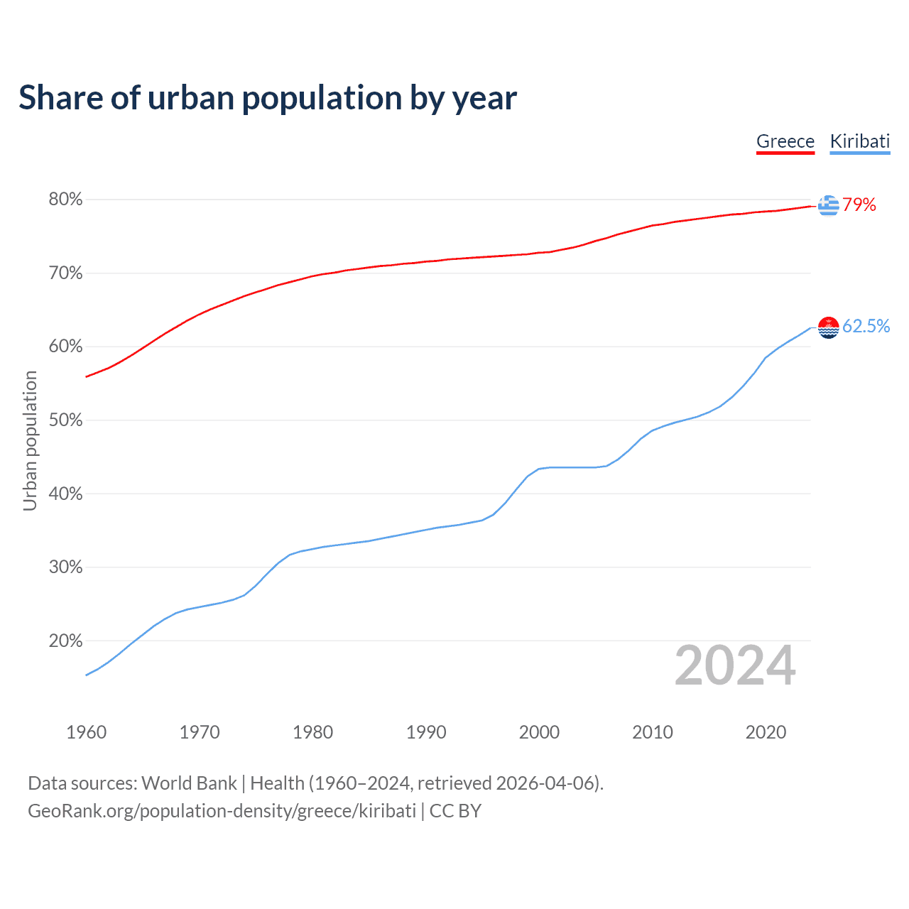 From 2004 to 2024, the share of urban population changed from 73.8% to 79% in Greece and from 43.5% to 62.5% in Kiribati.