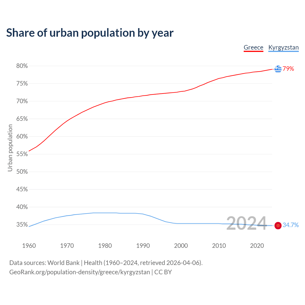 From 2004 to 2024, the share of urban population changed from 73.8% to 79% in Greece and from 35.3% to 34.7% in Kyrgyzstan.