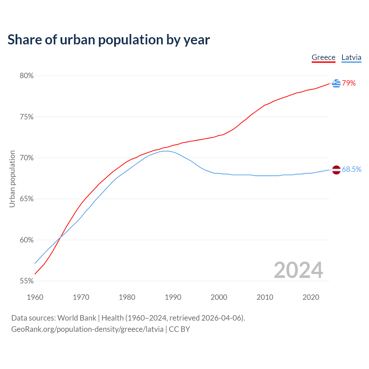 From 2004 to 2024, the share of urban population changed from 73.8% to 79% in Greece and from 67.9% to 68.5% in Latvia.