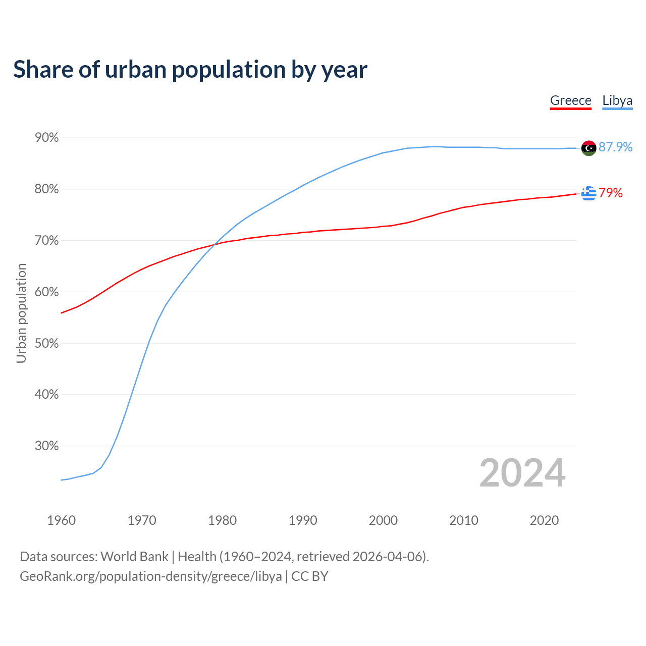 From 2004 to 2024, the share of urban population changed from 73.8% to 79% in Greece and from 88% to 87.9% in Libya.