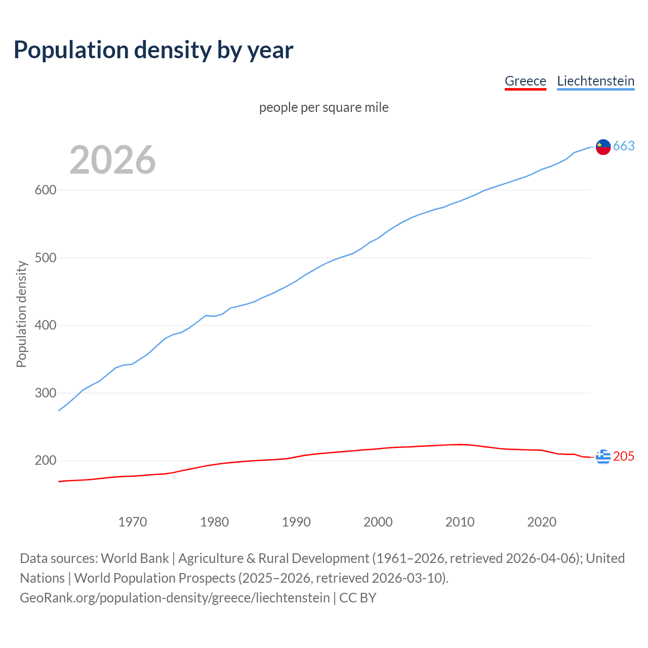 From 2006 to 2026, population density in Greece decreased by 7.61%, compared to a 16.9% growth in Liechtenstein.