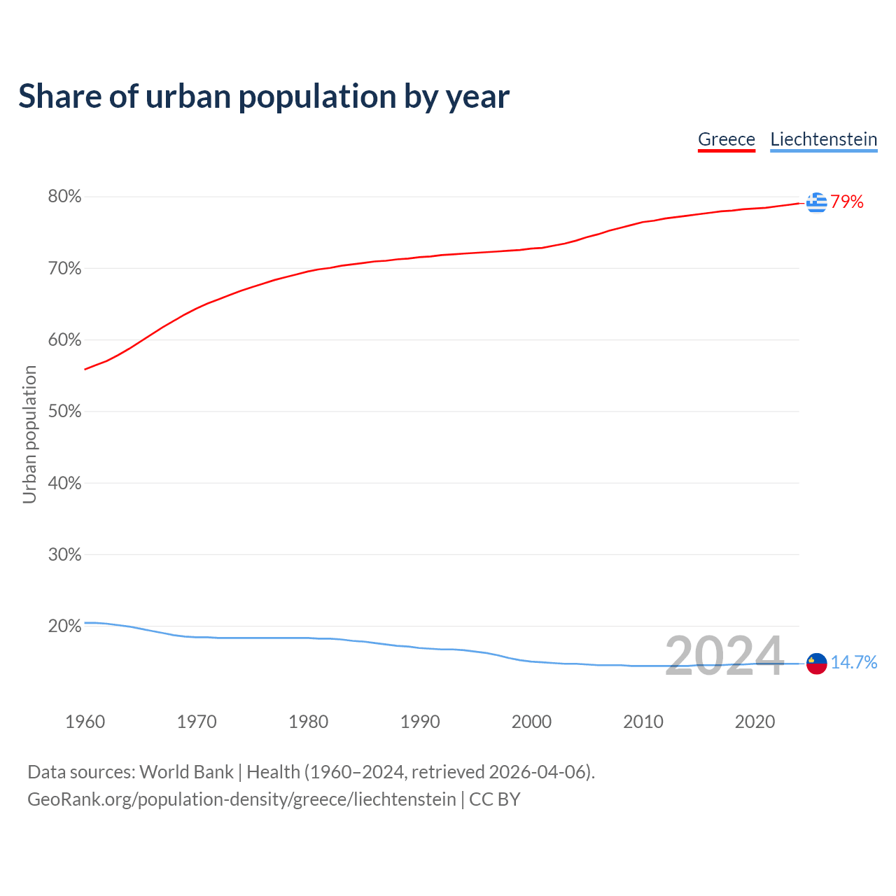 From 2004 to 2024, the share of urban population changed from 73.8% to 79% in Greece and from 14.7% to 14.7% in Liechtenstein.