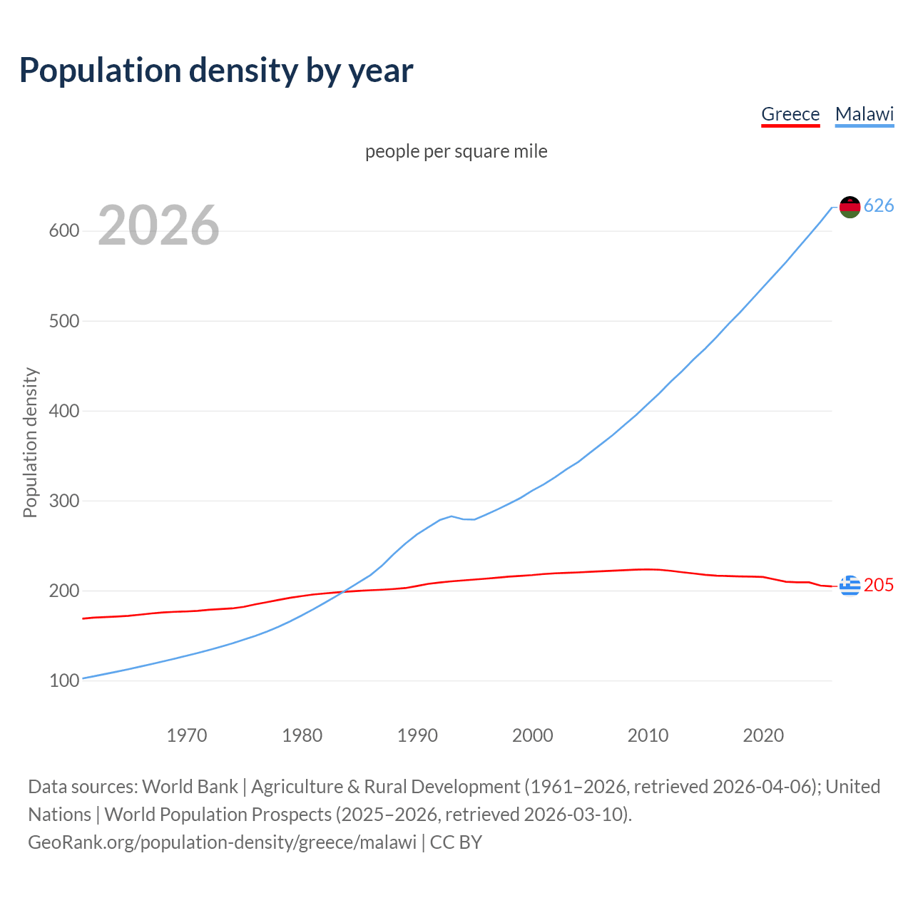 From 2006 to 2026, population density in Greece decreased by 7.61%, compared to a 72.7% growth in Malawi.