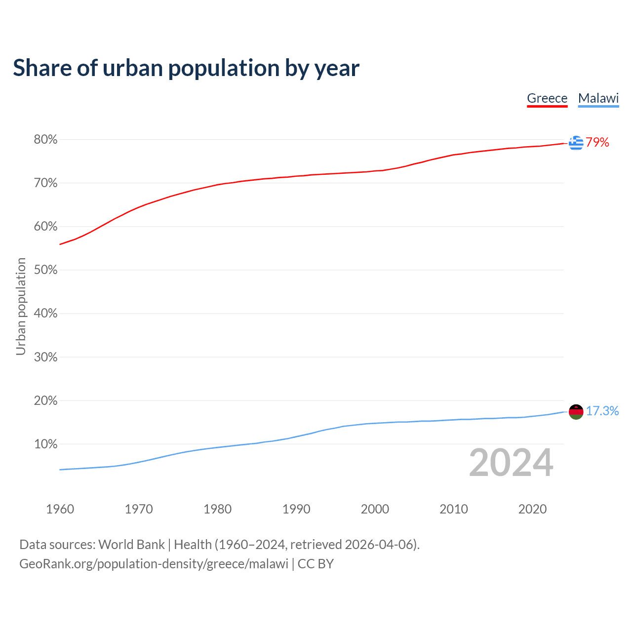 From 2004 to 2024, the share of urban population changed from 73.8% to 79% in Greece and from 15% to 17.3% in Malawi.