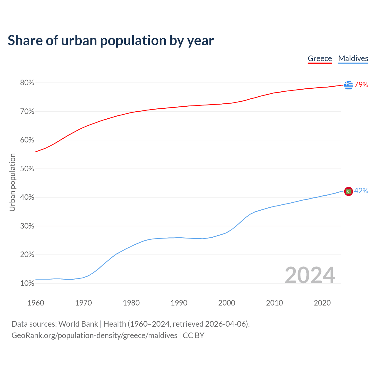 From 2004 to 2024, the share of urban population changed from 73.8% to 79% in Greece and from 32.9% to 42% in Maldives.