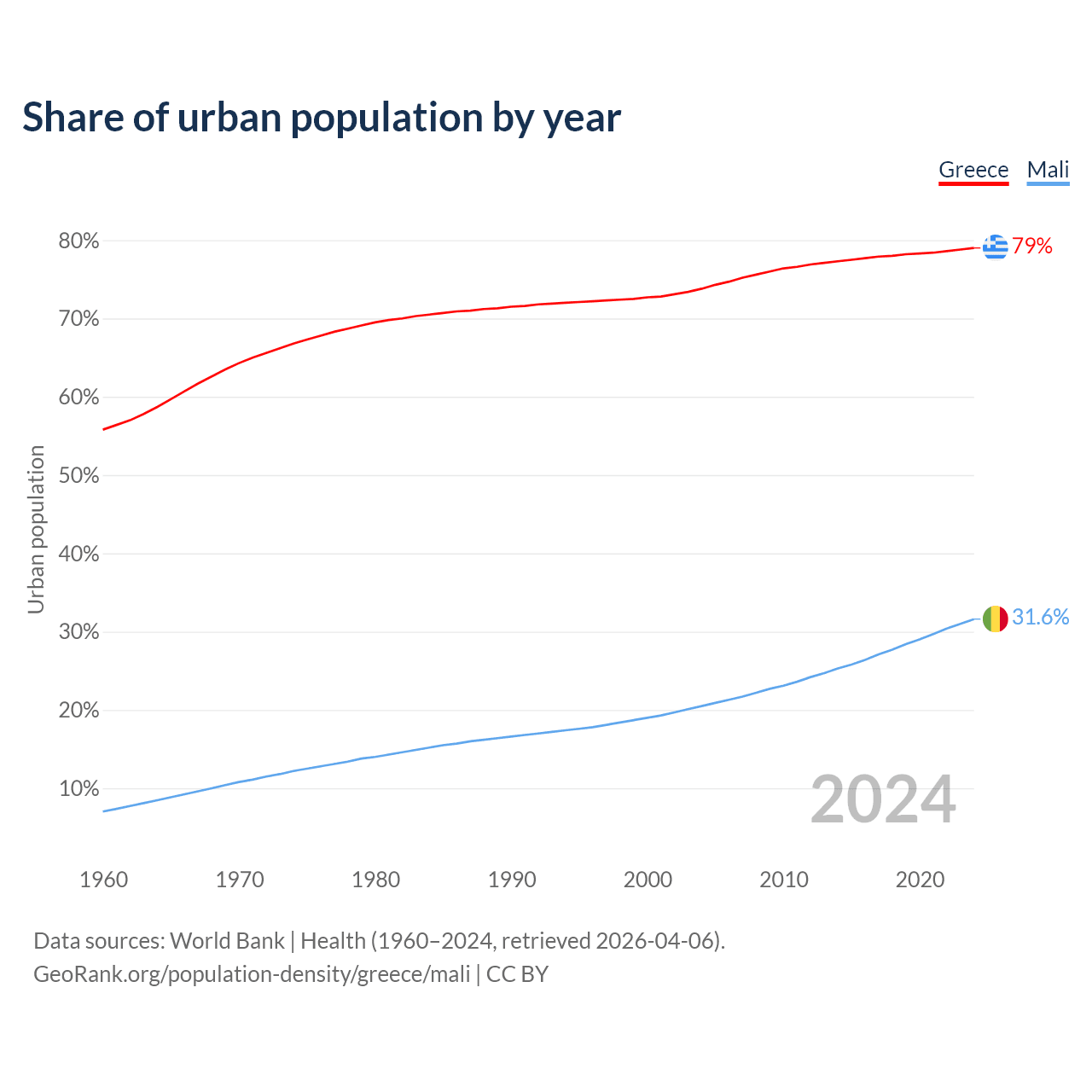 From 2004 to 2024, the share of urban population changed from 73.8% to 79% in Greece and from 20.5% to 31.6% in Mali.