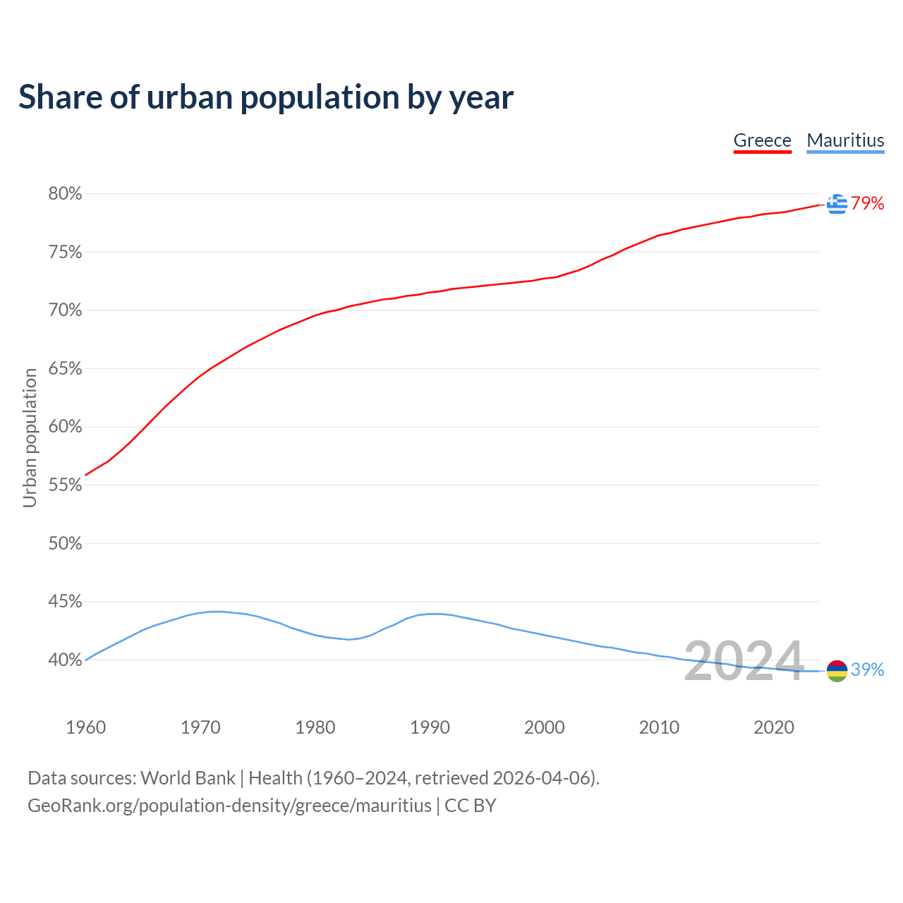 From 2004 to 2024, the share of urban population changed from 73.8% to 79% in Greece and from 41.3% to 39% in Mauritius.
