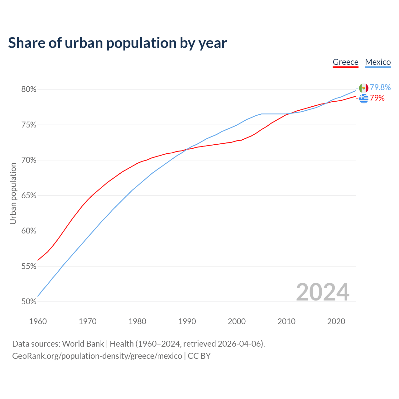 From 2004 to 2024, the share of urban population changed from 73.8% to 79% in Greece and from 76.3% to 79.8% in Mexico.