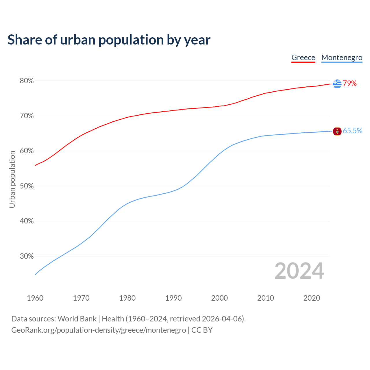 From 2004 to 2024, the share of urban population changed from 73.8% to 79% in Greece and from 62.2% to 65.5% in Montenegro.