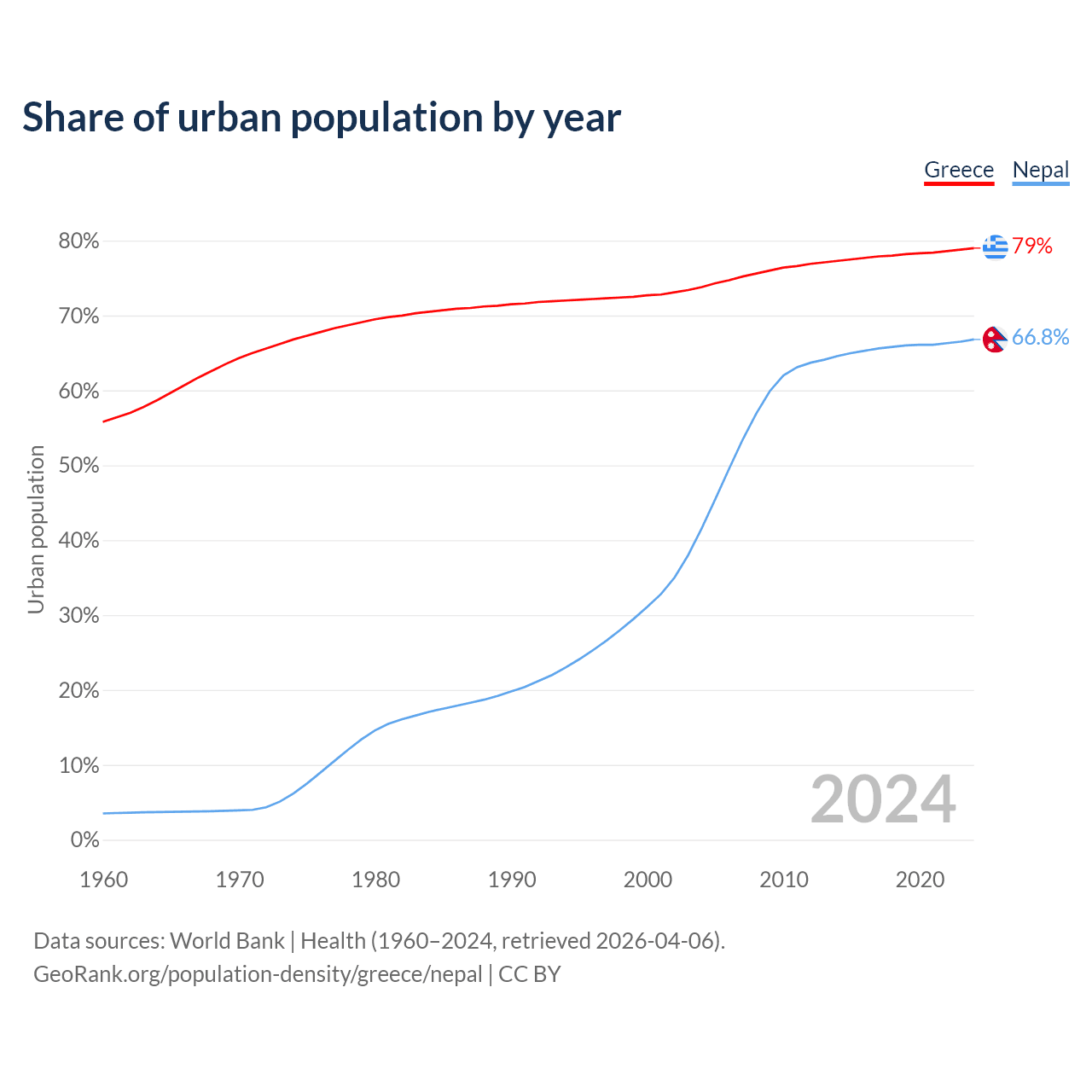 From 2004 to 2024, the share of urban population changed from 73.8% to 79% in Greece and from 41.6% to 66.8% in Nepal.