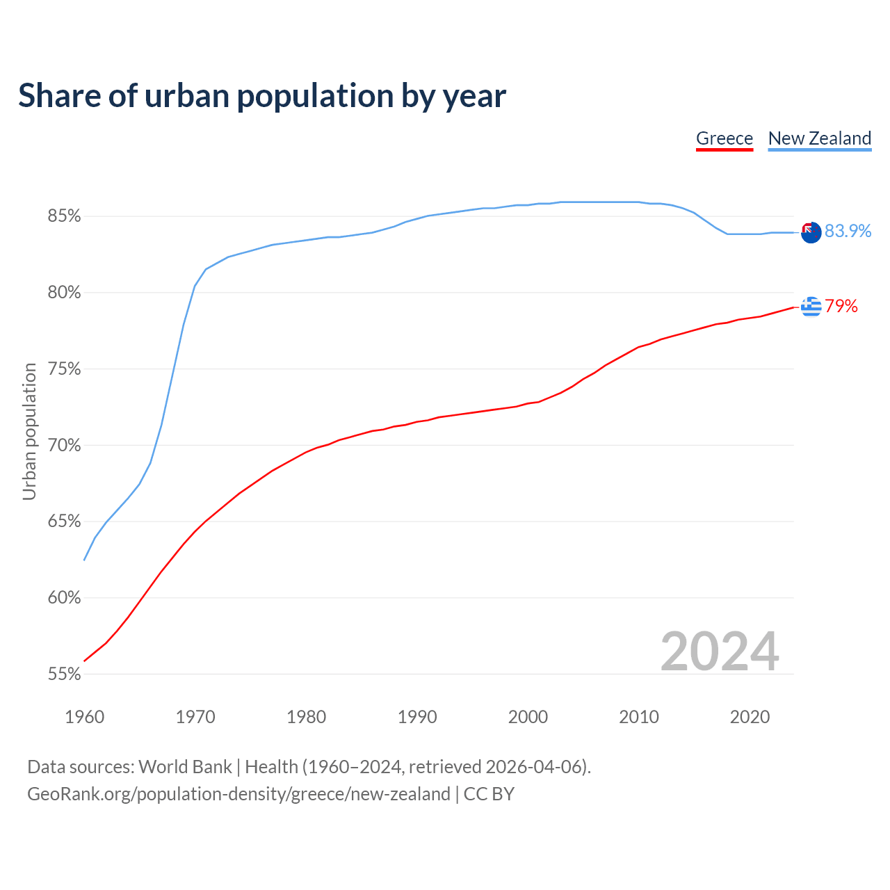 From 2004 to 2024, the share of urban population changed from 73.8% to 79% in Greece and from 85.9% to 83.9% in New Zealand.