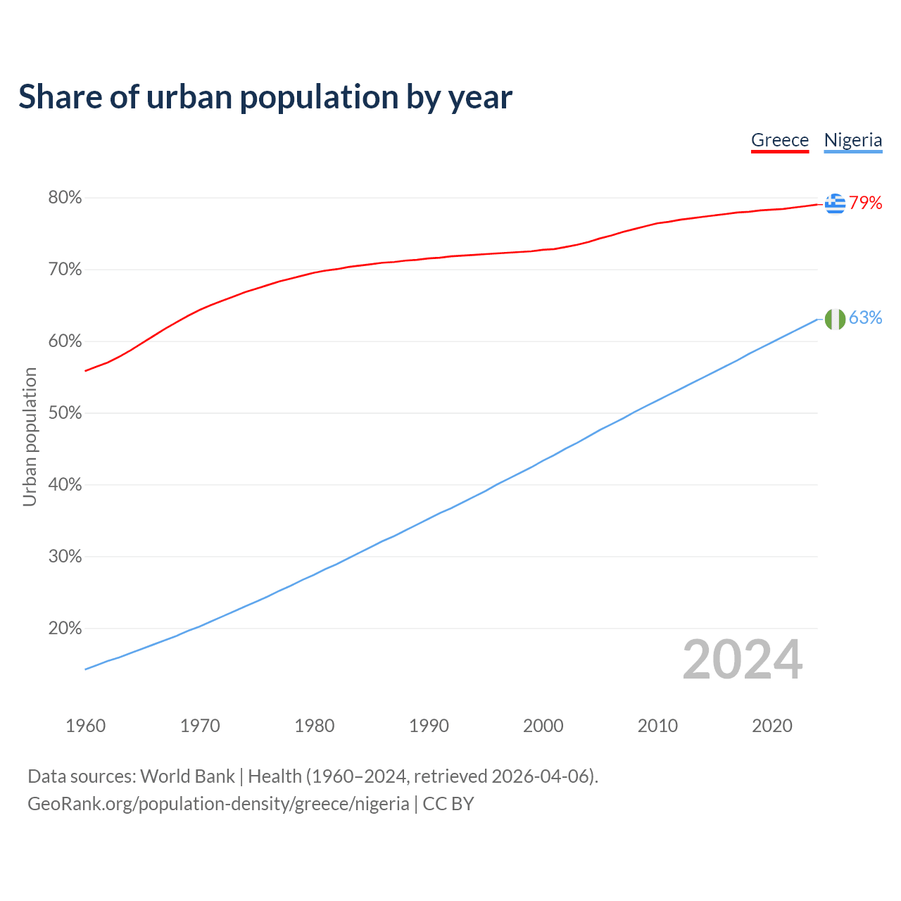 From 2004 to 2024, the share of urban population changed from 73.8% to 79% in Greece and from 46.7% to 63% in Nigeria.