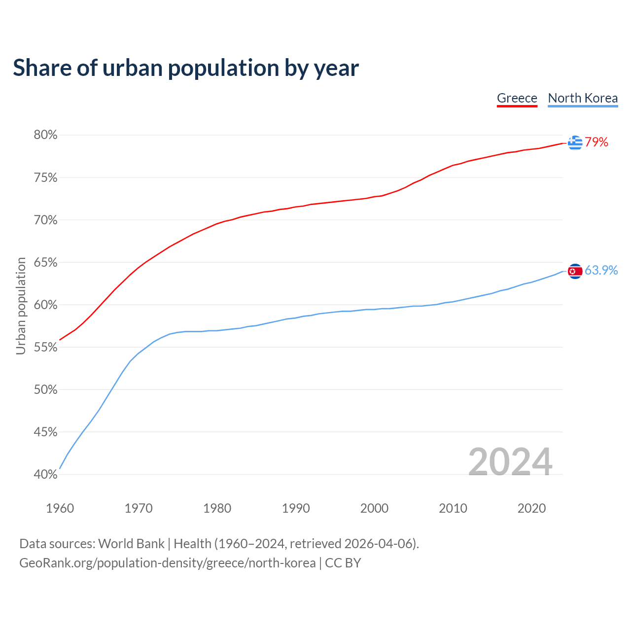 From 2004 to 2024, the share of urban population changed from 73.8% to 79% in Greece and from 59.7% to 63.9% in North Korea.
