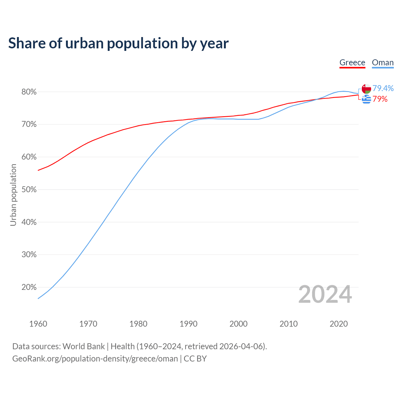 From 2004 to 2024, the share of urban population changed from 73.8% to 79% in Greece and from 71.5% to 79.4% in Oman.