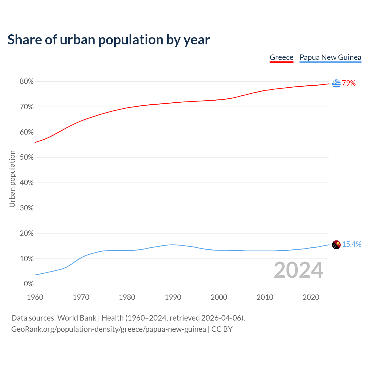 From 2004 to 2024, the share of urban population changed from 73.8% to 79% in Greece and from 13.1% to 15.4% in Papua New Guinea.