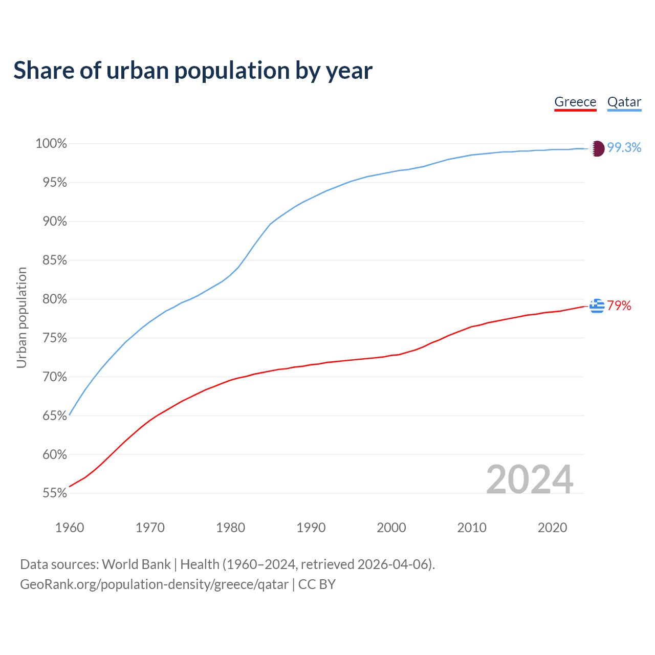 From 2004 to 2024, the share of urban population changed from 73.8% to 79% in Greece and from 97% to 99.3% in Qatar.