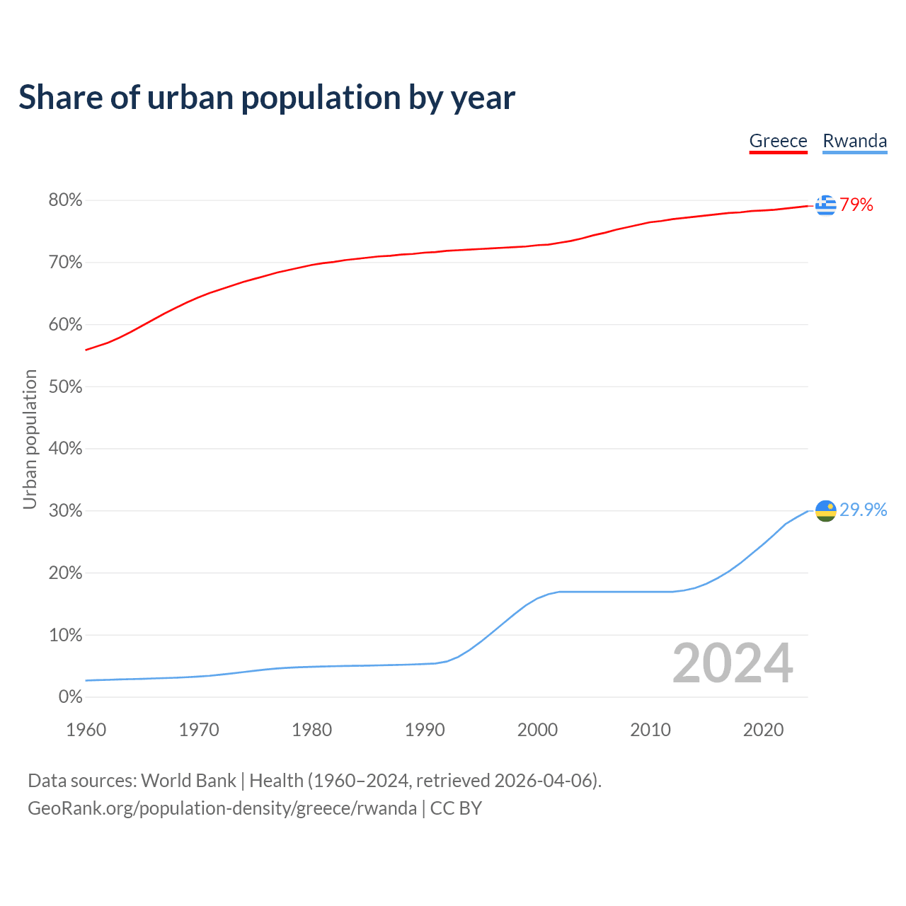 From 2004 to 2024, the share of urban population changed from 73.8% to 79% in Greece and from 16.9% to 29.9% in Rwanda.