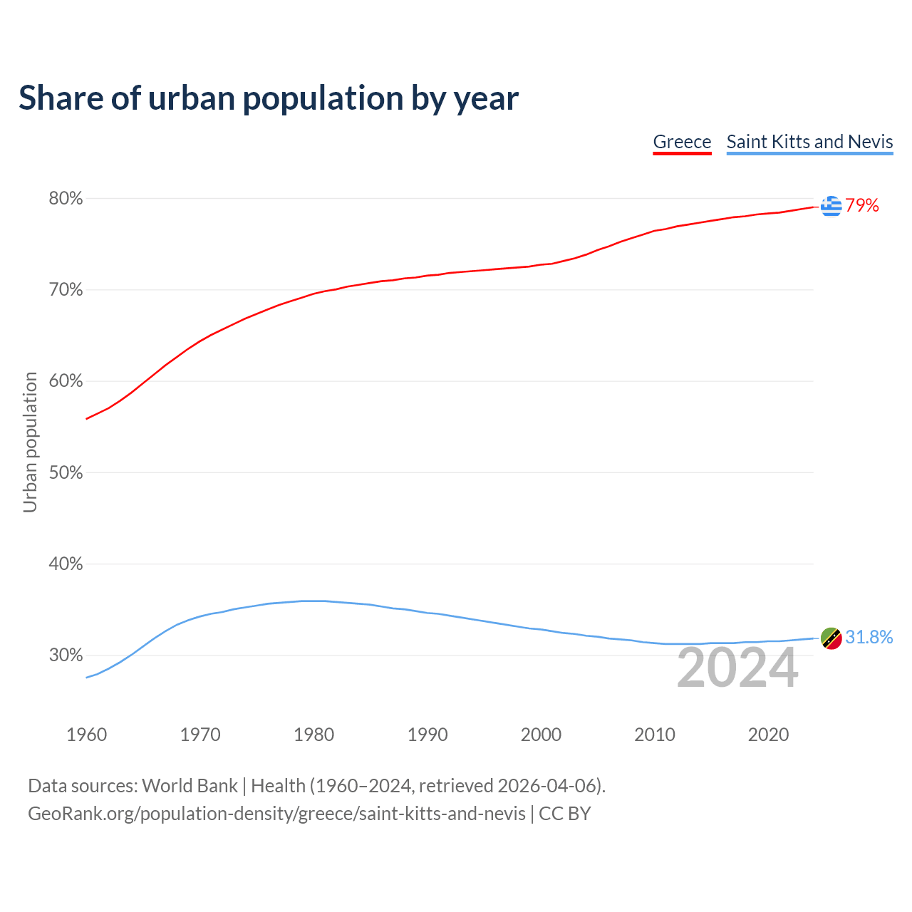 From 2004 to 2024, the share of urban population changed from 73.8% to 79% in Greece and from 32.1% to 31.8% in Saint Kitts and Nevis.