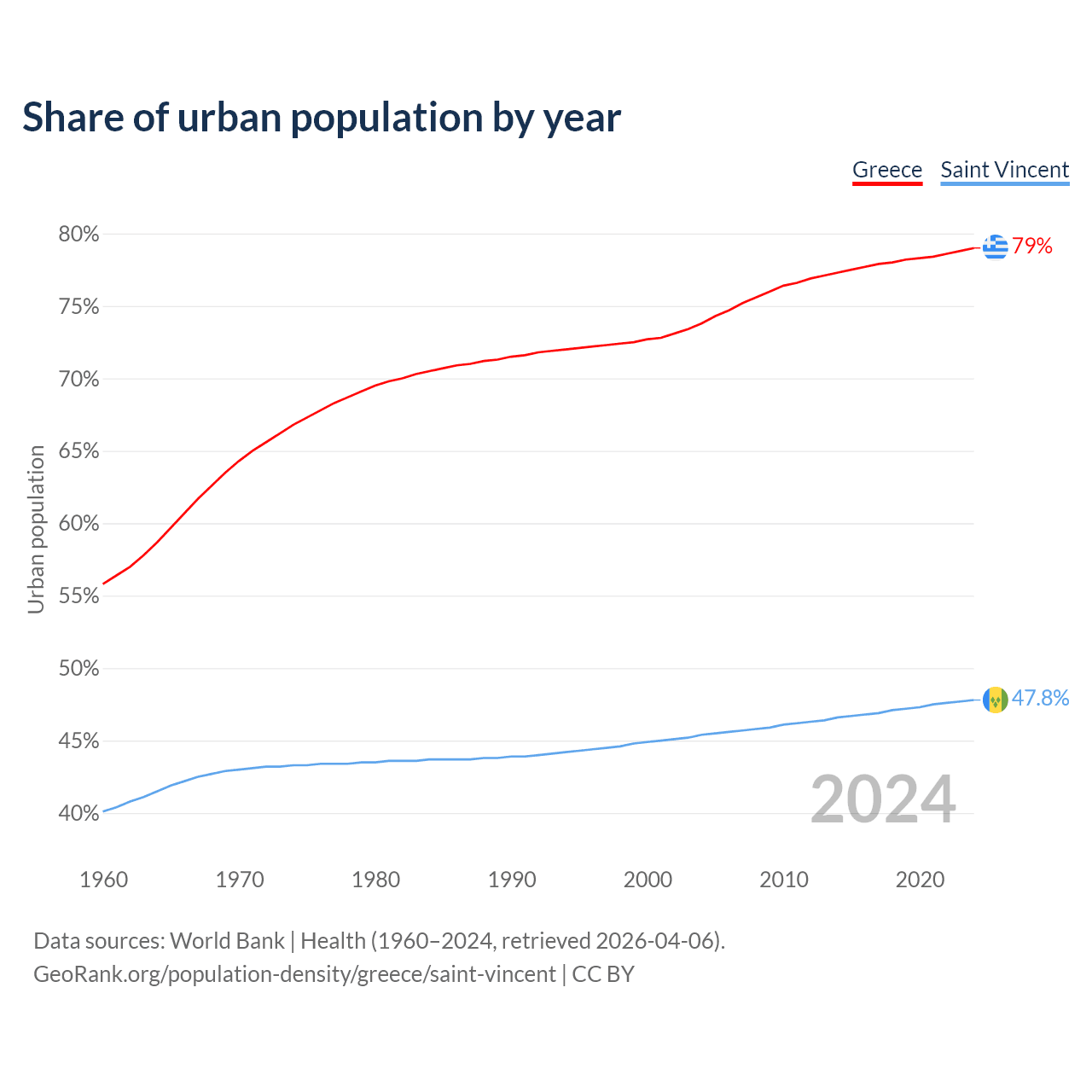 From 2004 to 2024, the share of urban population changed from 73.8% to 79% in Greece and from 45.4% to 47.8% in Saint Vincent.