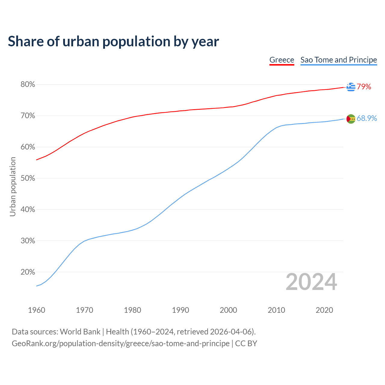 From 2004 to 2024, the share of urban population changed from 73.8% to 79% in Greece and from 57.9% to 68.9% in Sao Tome and Principe.