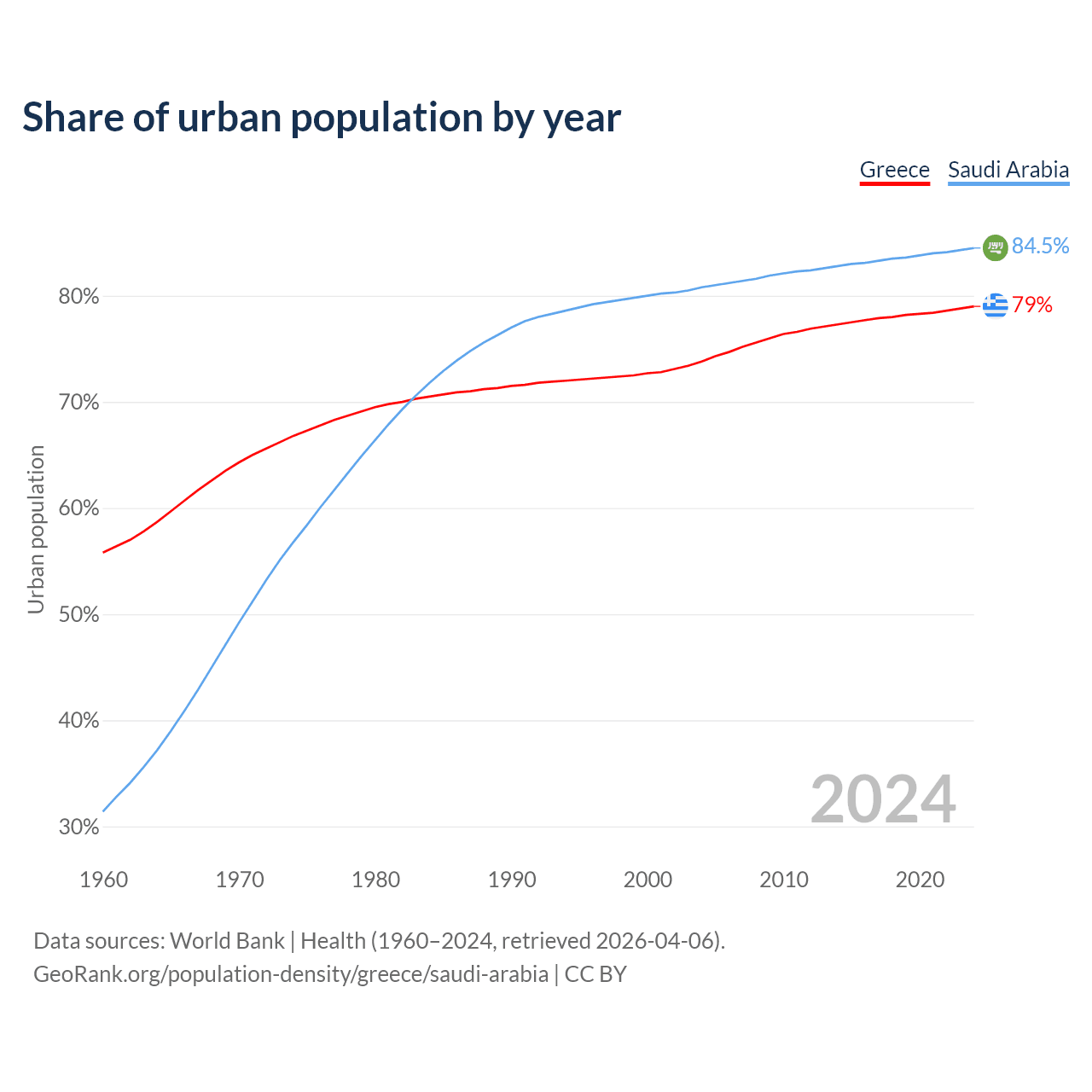 From 2004 to 2024, the share of urban population changed from 73.8% to 79% in Greece and from 80.8% to 84.5% in Saudi Arabia.