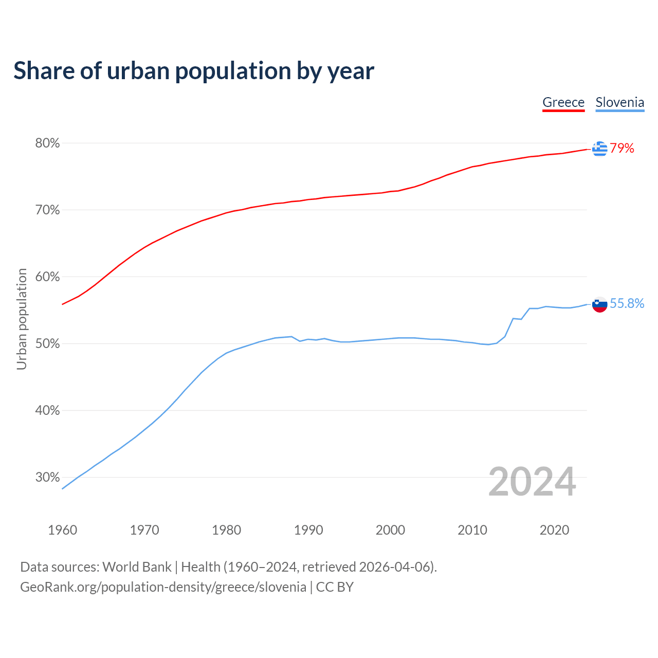 From 2004 to 2024, the share of urban population changed from 73.8% to 79% in Greece and from 50.7% to 55.8% in Slovenia.