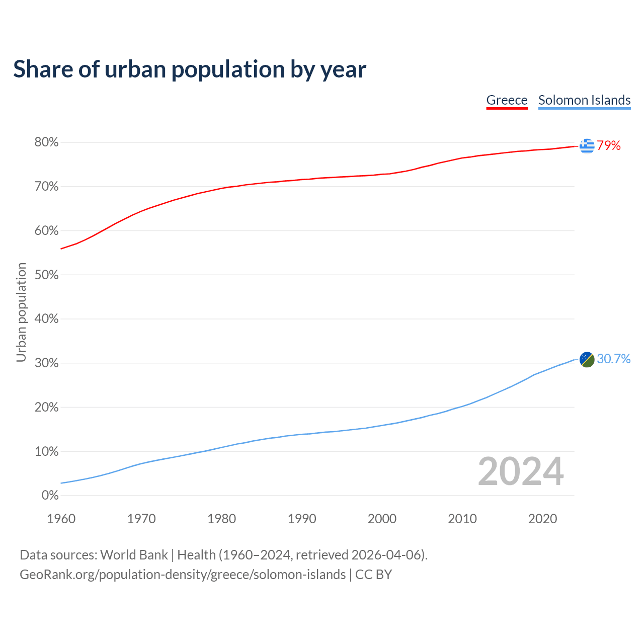 From 2004 to 2024, the share of urban population changed from 73.8% to 79% in Greece and from 17.2% to 30.7% in the Solomon Islands.