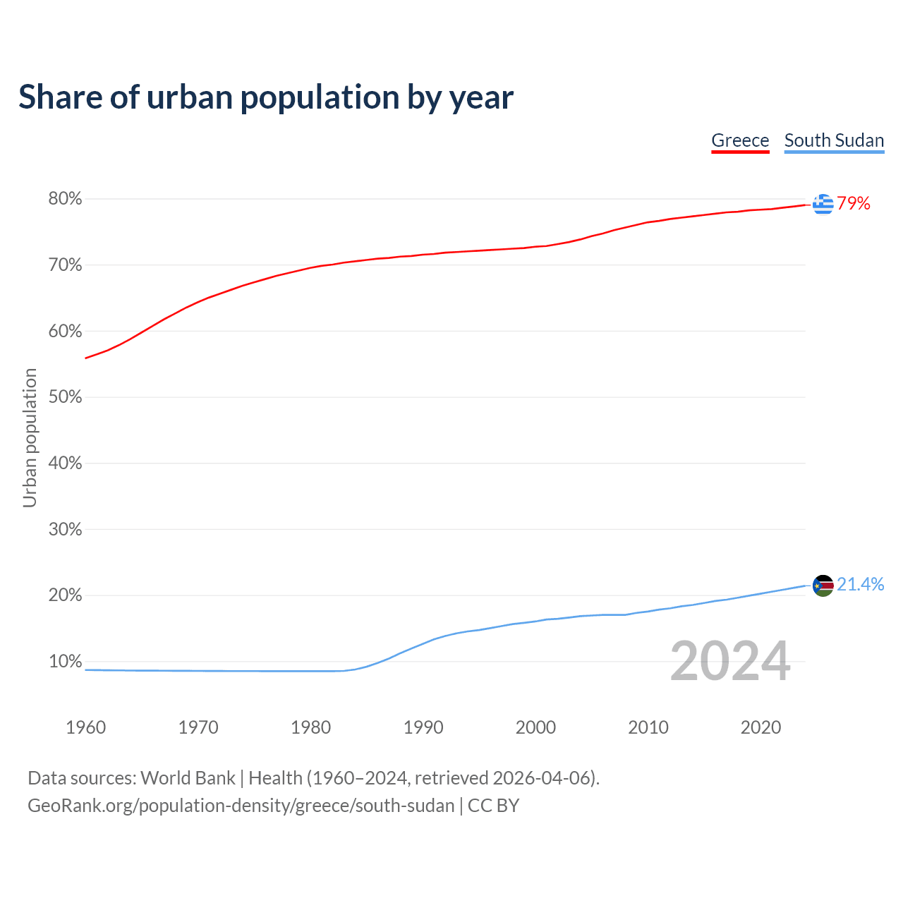 From 2004 to 2024, the share of urban population changed from 73.8% to 79% in Greece and from 16.8% to 21.4% in South Sudan.