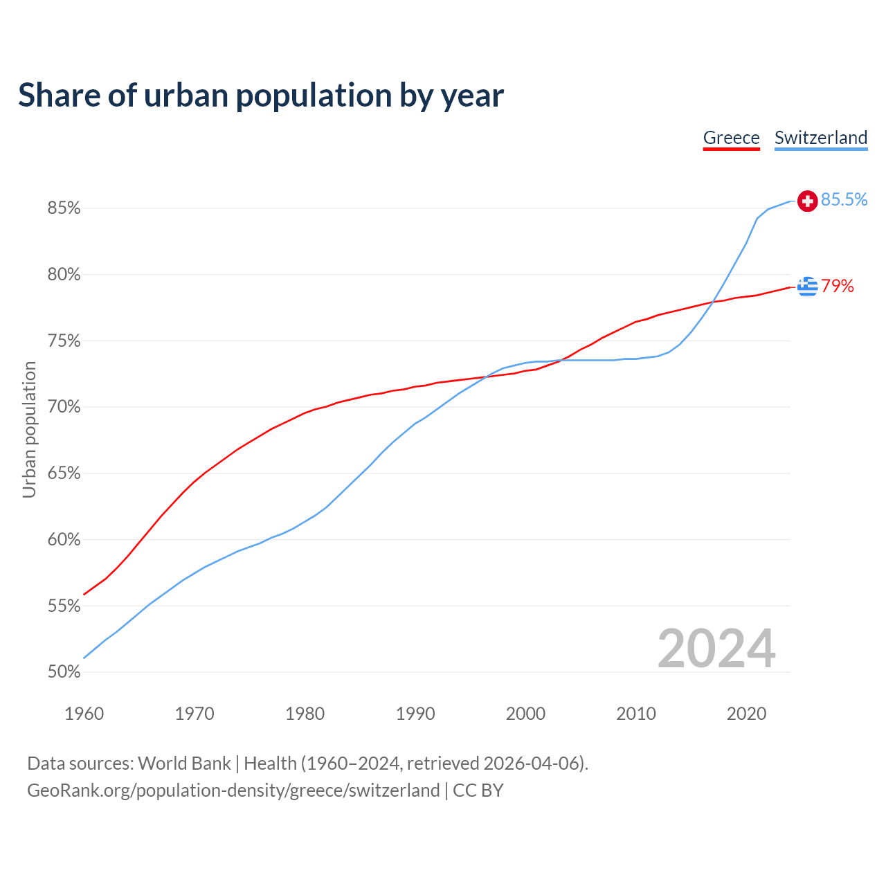 From 2004 to 2024, the share of urban population changed from 73.8% to 79% in Greece and from 73.5% to 85.5% in Switzerland.