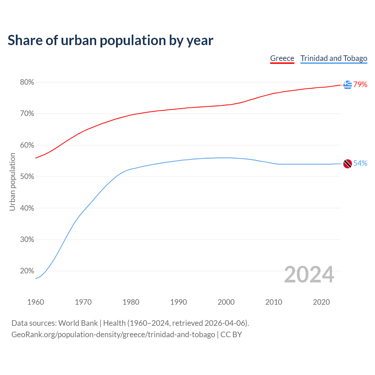 From 2004 to 2024, the share of urban population changed from 73.8% to 79% in Greece and from 55.6% to 54% in Trinidad and Tobago.