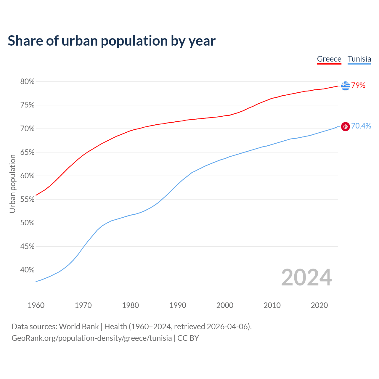 From 2004 to 2024, the share of urban population changed from 73.8% to 79% in Greece and from 64.9% to 70.4% in Tunisia.