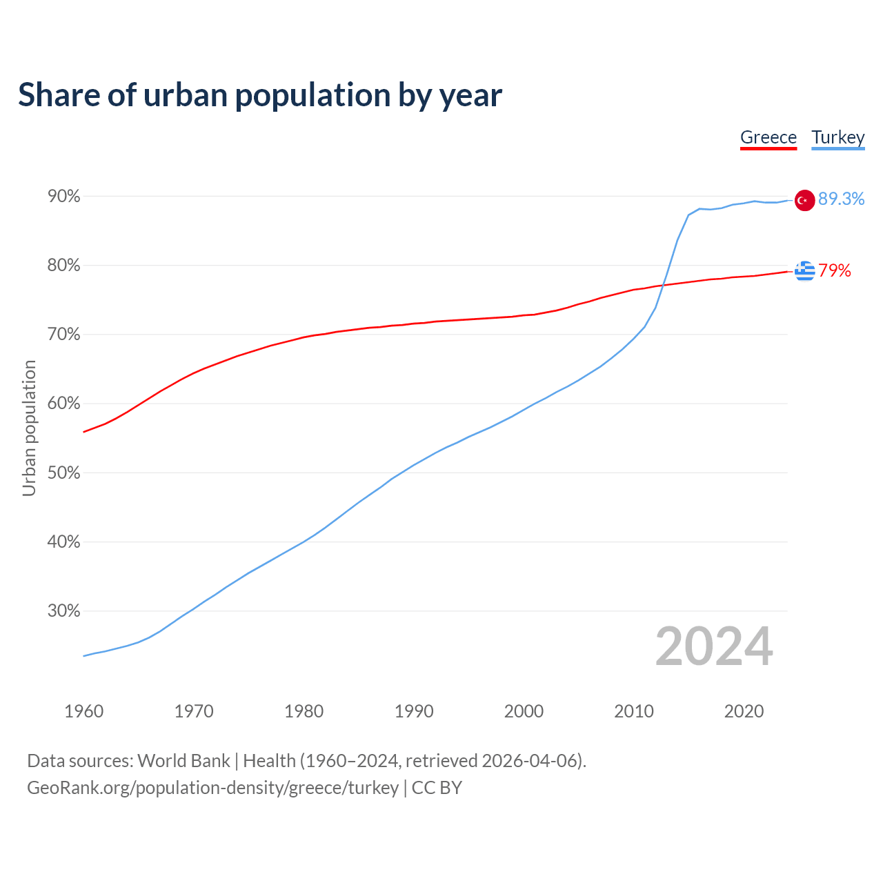 From 2004 to 2024, the share of urban population changed from 73.8% to 79% in Greece and from 62.4% to 89.3% in Turkey.