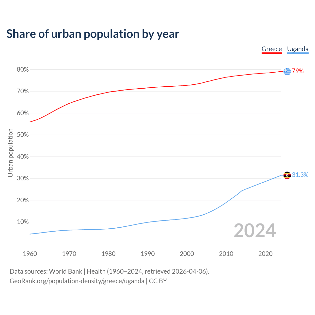 From 2004 to 2024, the share of urban population changed from 73.8% to 79% in Greece and from 13.1% to 31.3% in Uganda.