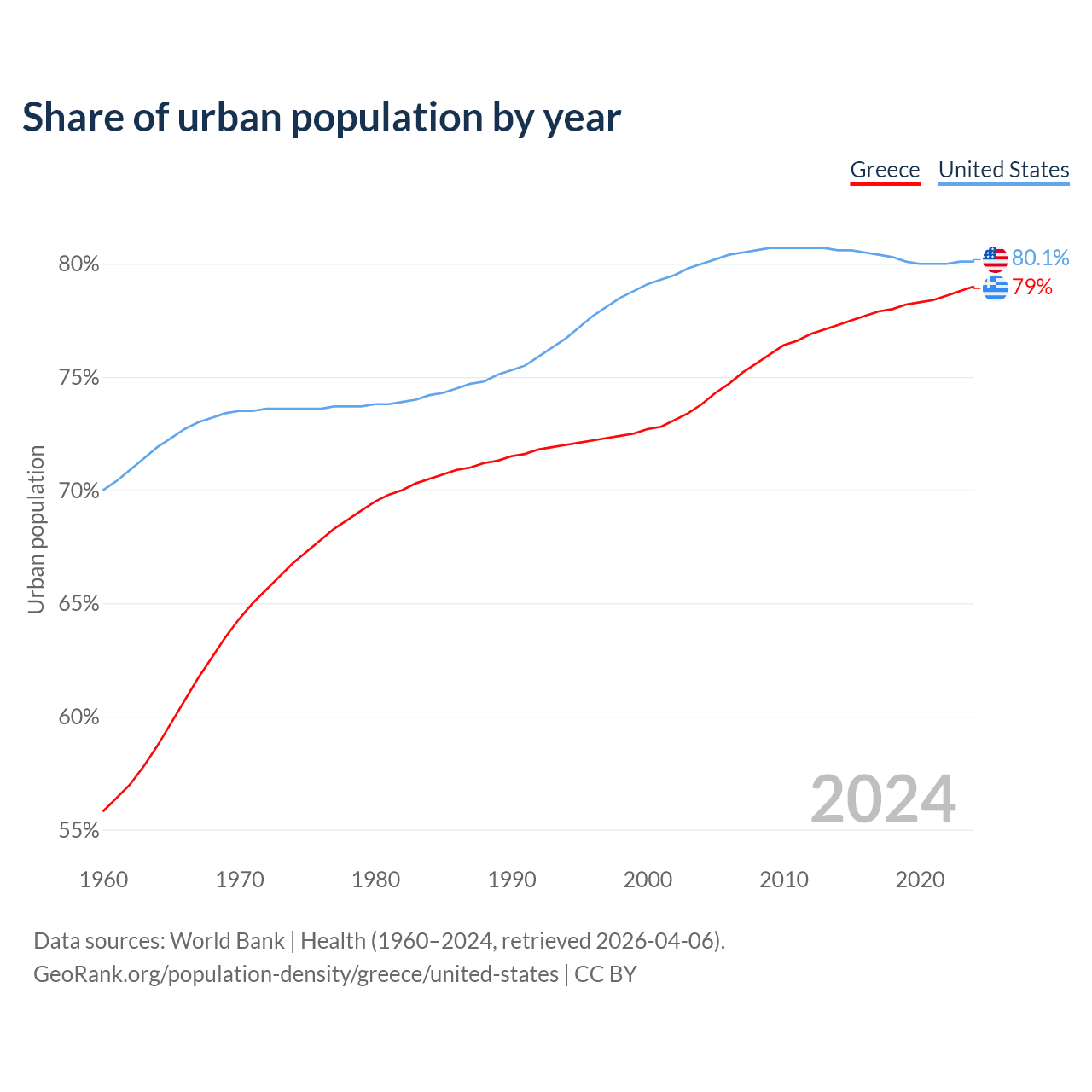 From 2004 to 2024, the share of urban population changed from 73.8% to 79% in Greece and from 80% to 80.1% in the United States.