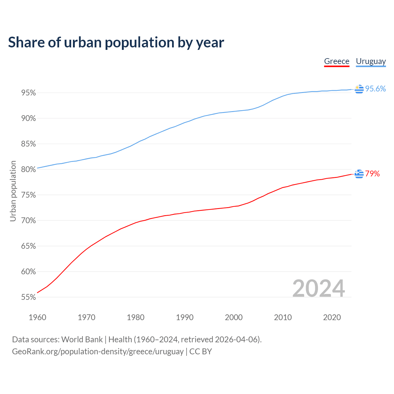 From 2004 to 2024, the share of urban population changed from 73.8% to 79% in Greece and from 91.8% to 95.6% in Uruguay.
