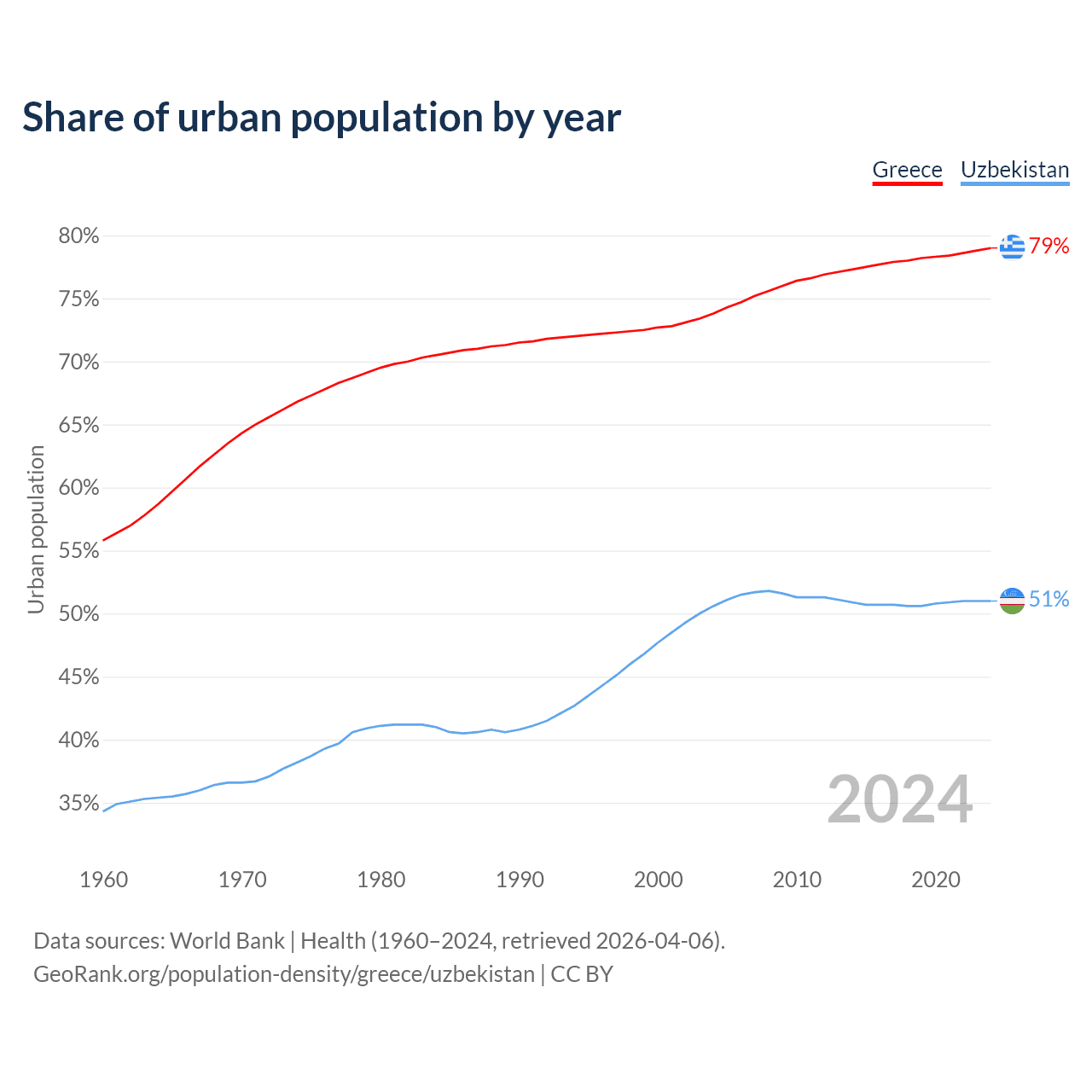 From 2004 to 2024, the share of urban population changed from 73.8% to 79% in Greece and from 50.6% to 51% in Uzbekistan.