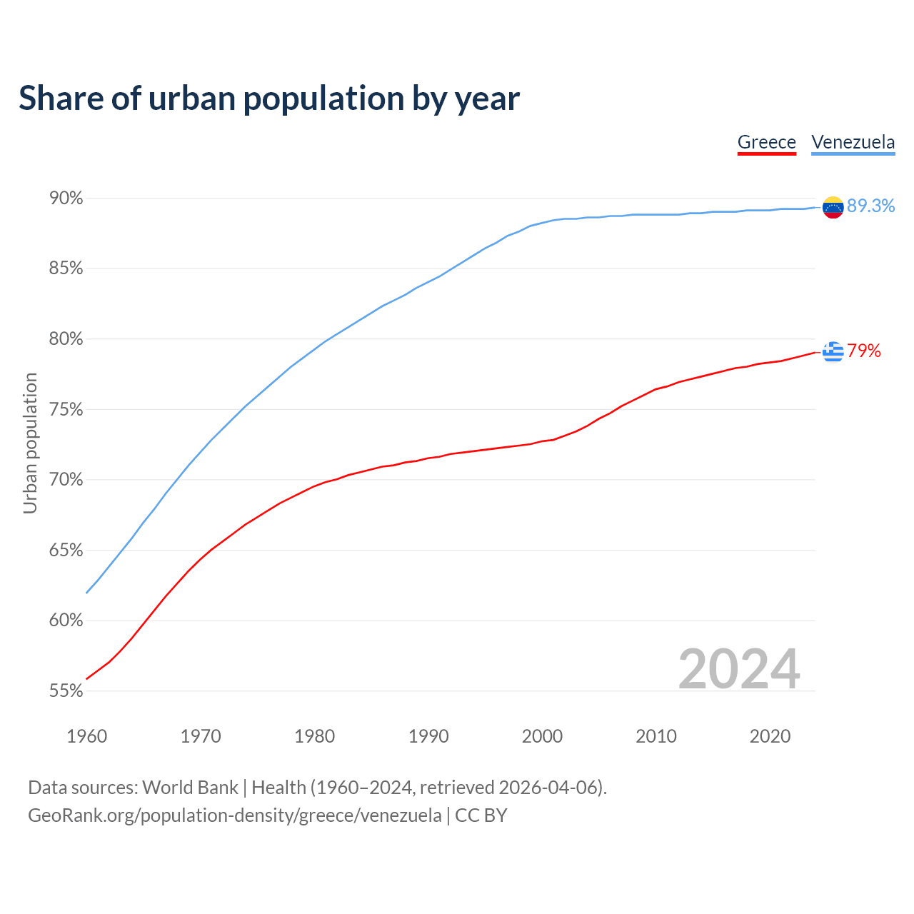 From 2004 to 2024, the share of urban population changed from 73.8% to 79% in Greece and from 88.6% to 89.3% in Venezuela.