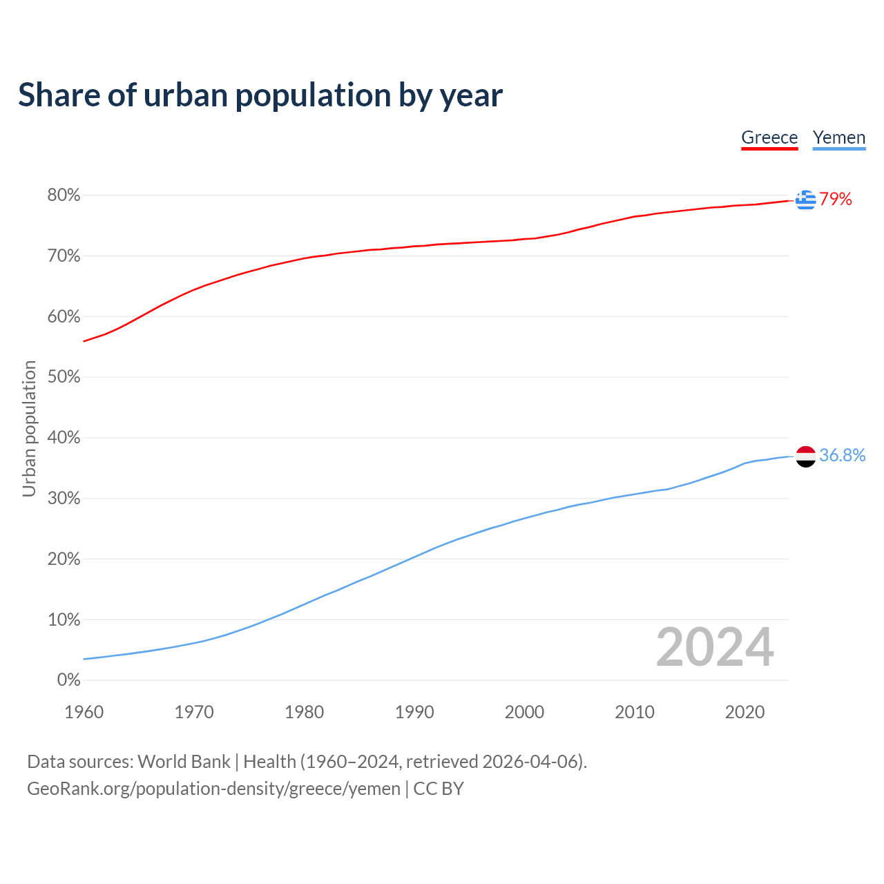 From 2004 to 2024, the share of urban population changed from 73.8% to 79% in Greece and from 28.5% to 36.8% in Yemen.