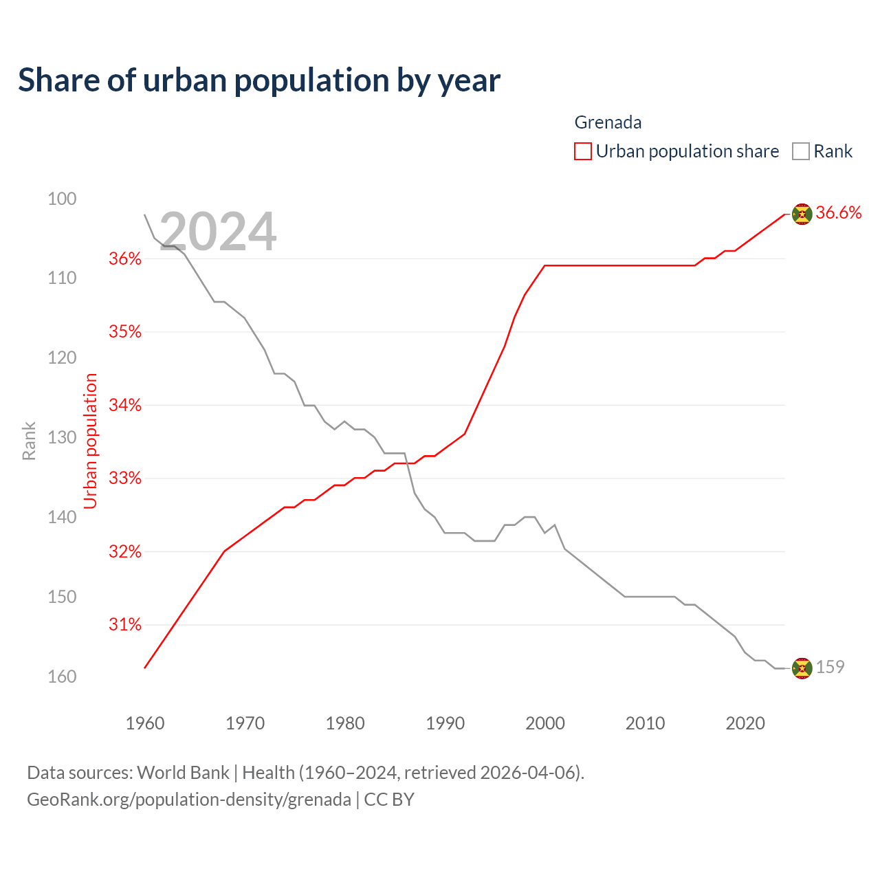 This chart shows the share of urban population in Grenada from 1960 to 2024: 30.4% lived in urban areas in 1960, 35.9% in 2000, and 36.6% in 2024.