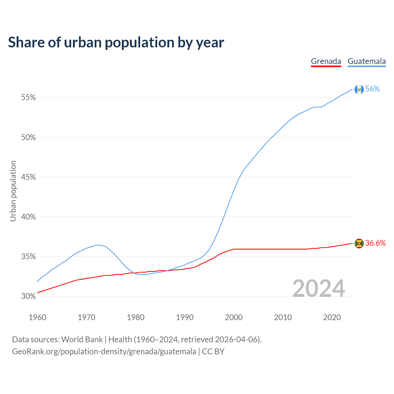 From 2004 to 2024, the share of urban population changed from 35.9% to 36.6% in Grenada and from 47.3% to 56% in Guatemala.