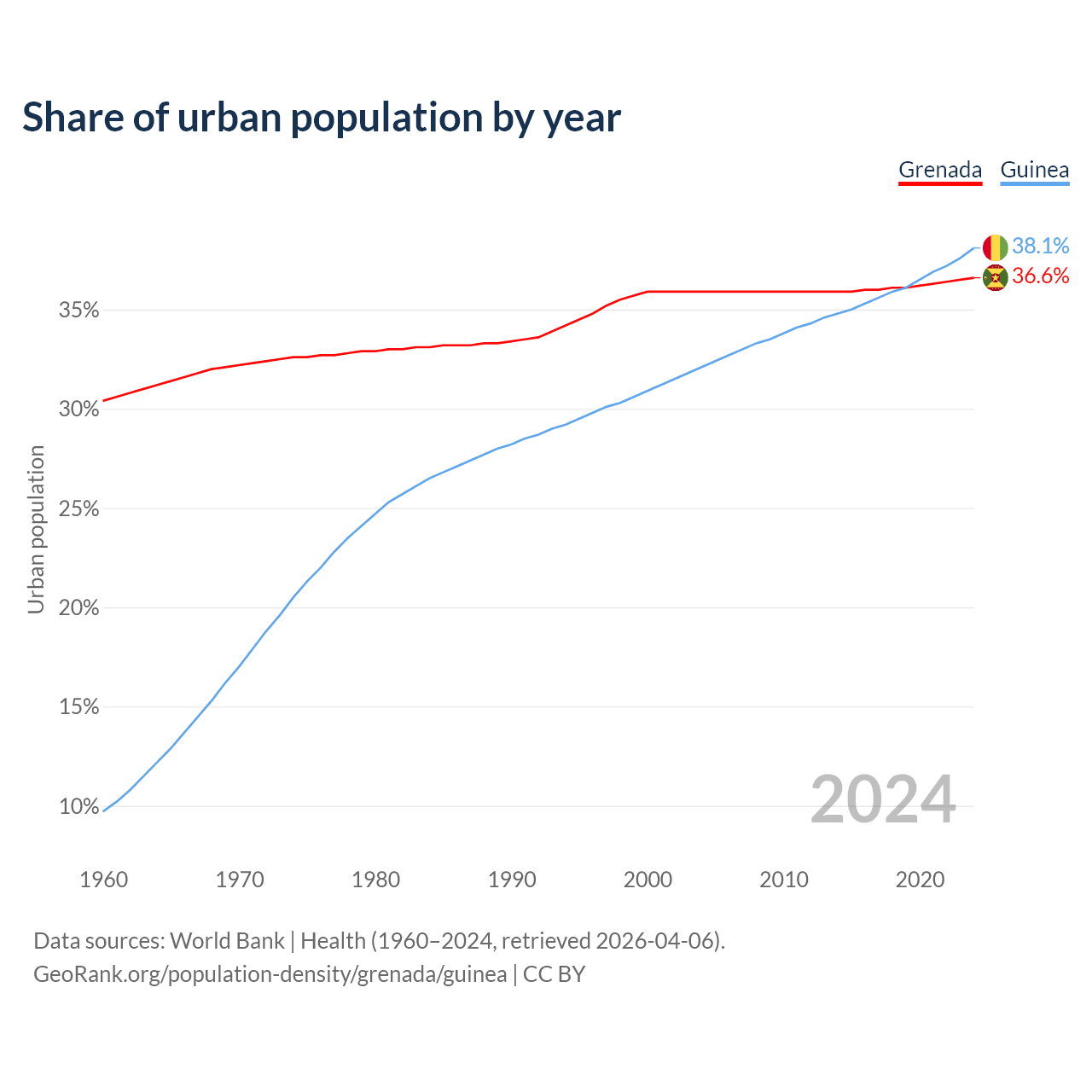 From 2004 to 2024, the share of urban population changed from 35.9% to 36.6% in Grenada and from 32.1% to 38.1% in Guinea.