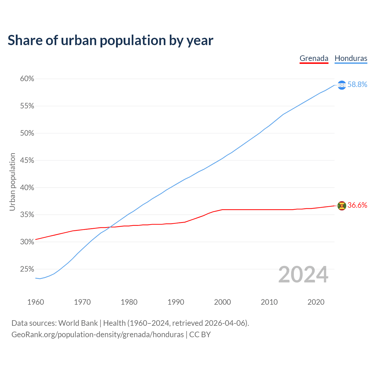 From 2004 to 2024, the share of urban population changed from 35.9% to 36.6% in Grenada and from 47.6% to 58.8% in Honduras.