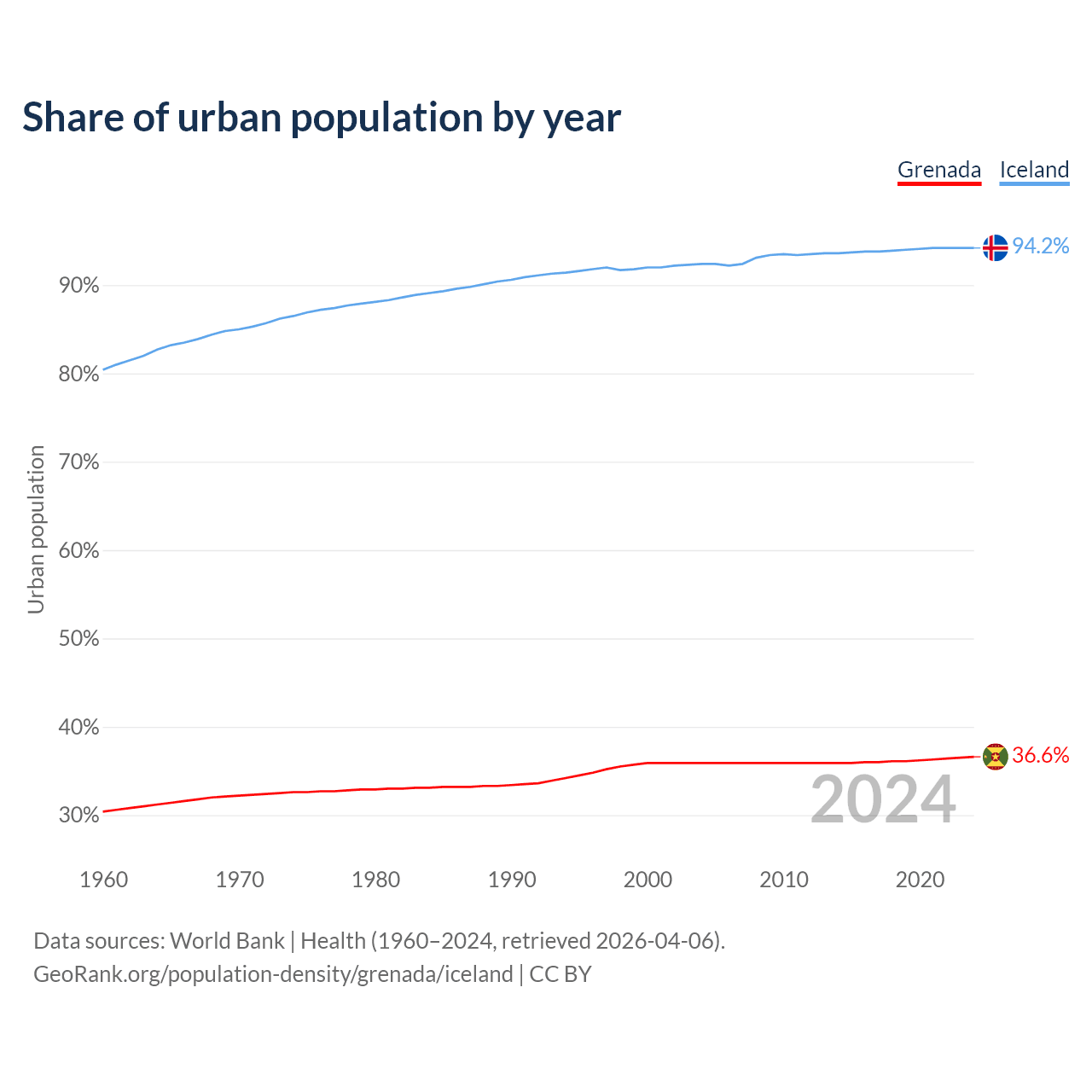From 2004 to 2024, the share of urban population changed from 35.9% to 36.6% in Grenada and from 92.4% to 94.2% in Iceland.