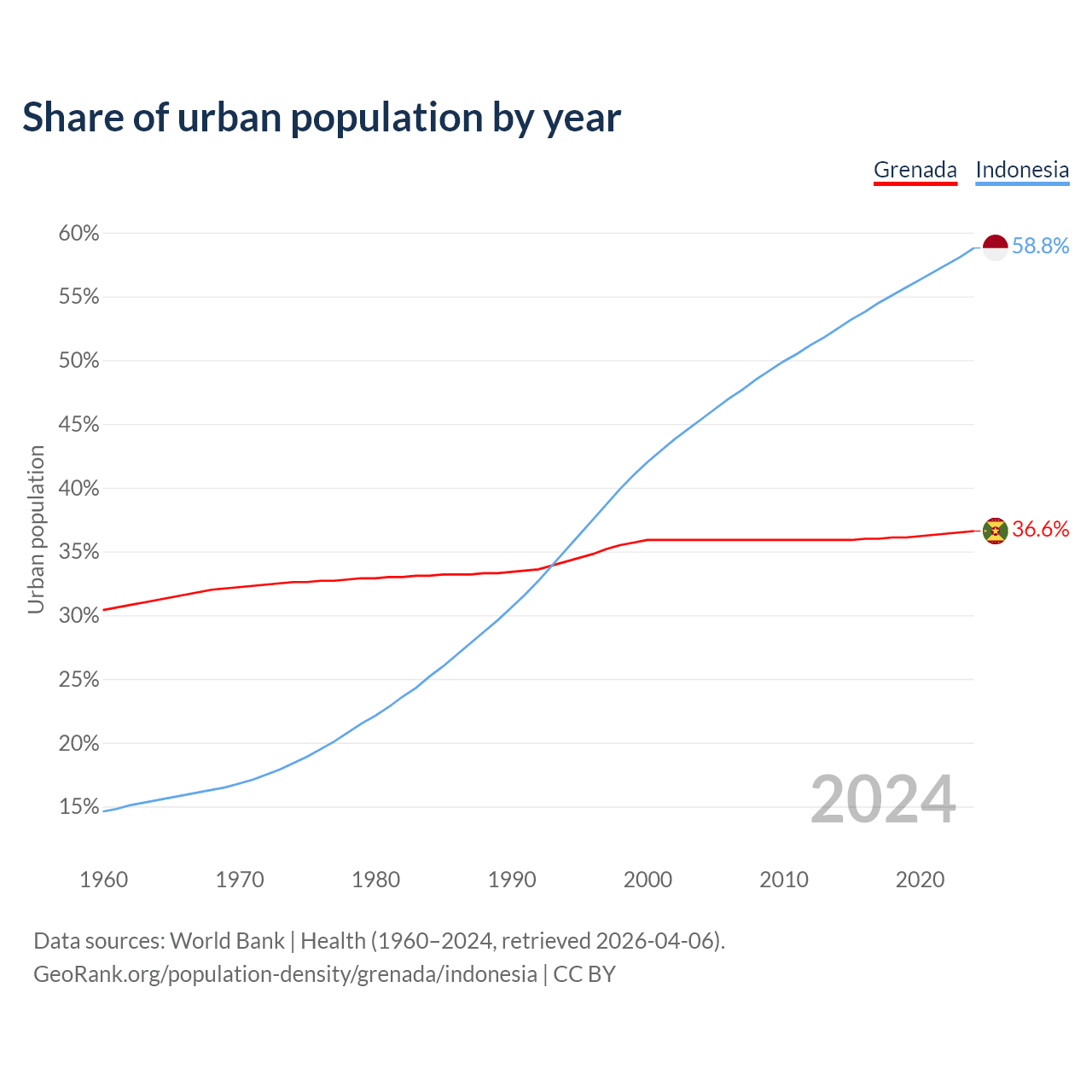 From 2004 to 2024, the share of urban population changed from 35.9% to 36.6% in Grenada and from 45.4% to 58.8% in Indonesia.